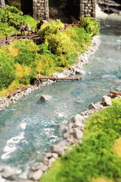 Die realistische Gestaltung von Modellgewässern, die bislang als eine der größten Herausforderungen für den ambitionierten Landschaftsbauer galt, ist dank den neuen NOCH Water-Drops ab jetzt kein Hexenwerk mehr. Denn die Verarbeitung ist denkbar unkompliziert: Die Water-Drops werden einfach in einem hitzebeständigen Behälter (z.B. Marmeladenglas) bei 170°C - 180°C für ca. 50 Minuten im Backofen erhitzt. Nach dem Schmelzen der Drops bleibt das Material ca. 3-4 Minuten lang in sirupartiger Konsistenz flüssig. Jetzt kann es ohne Hektik in das vorbereitete Bach- oder Seebett gegossen werden. Ist das Wasser auf Ihrer Modell-Landschaft ausgehärtet, und Sie wünschen weitere Änderungen an der Wasseroberfläche - kein Problem: Mit einem Haarfön können Sie die Oberfläche jederzeit anschmelzen und nachbearbeiten. Mit einer Heißluftpistole können Sie sogar das gesamte Wasser-Dops-Gewässer verflüssigen. Übrigens eignet sich ein handelsüblicher Haartrockner auch ideal um nachträglich Wellen oder Stromschnellen auszuarbeiten. NOCH Water-Drops gibt es in zwei Varianten: "Water-Drops transparent" enthält 250 g transparente Drops für kristallklare, durchsichtige Seen, Flüsse oder Bäche. "Water-Drops color" enthält 250 g transparente Drops und zum Mischen je 25 g blaue, grüne und braune Drops, um ganz individuelle Farbwirkungen des Wassers zu erzielen.
